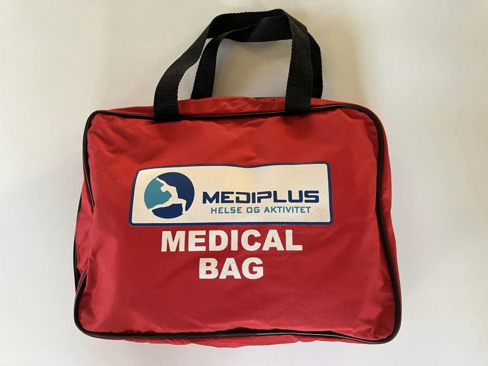 Bag fylt med masse treningsutstyr, en velutstyrt førstehjelpsmappe og 20 stk Brannskadepakker. Du kan i tillegg velge å få med deg 500 ml klister, 200 ml klisterrens.